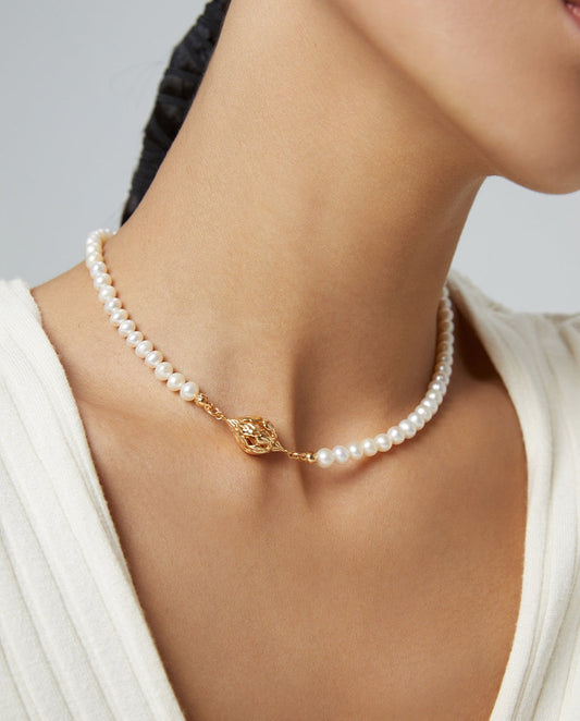 White pearl necklace, silver & gold