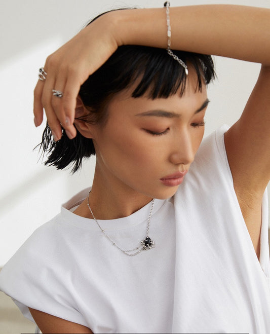 Black gemstone chain necklace, silver & gold
