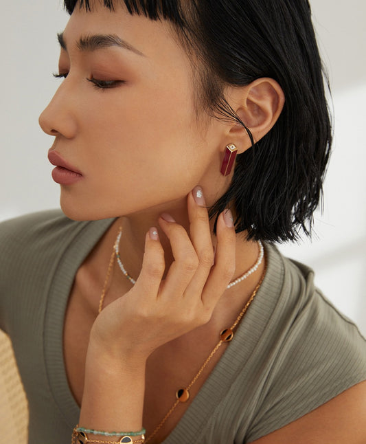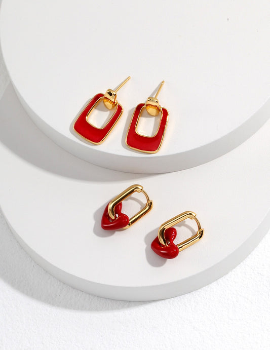 Minimalist gold earrings with red drip glaze