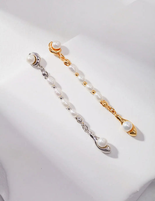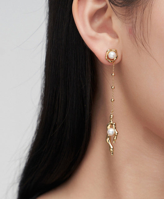 Long style gold pearl earrings