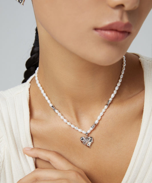 Stitched Heart-Shaped Pendant with Pearl Strand Necklace