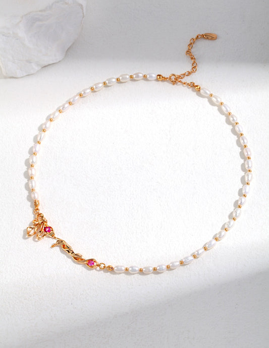 Coquette Ribbon with Magenta Gemstone Pearl Necklace