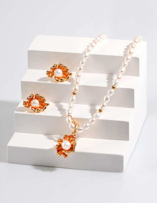 Rose Shaped Dainty Pendant with Pearls and Gold Chain Necklace